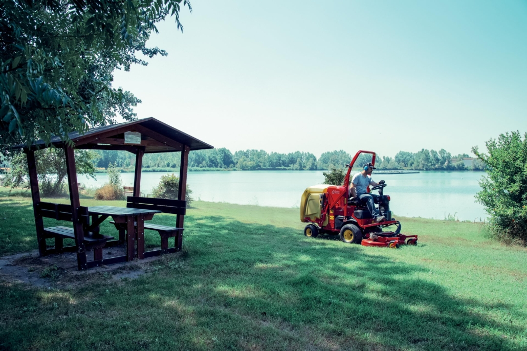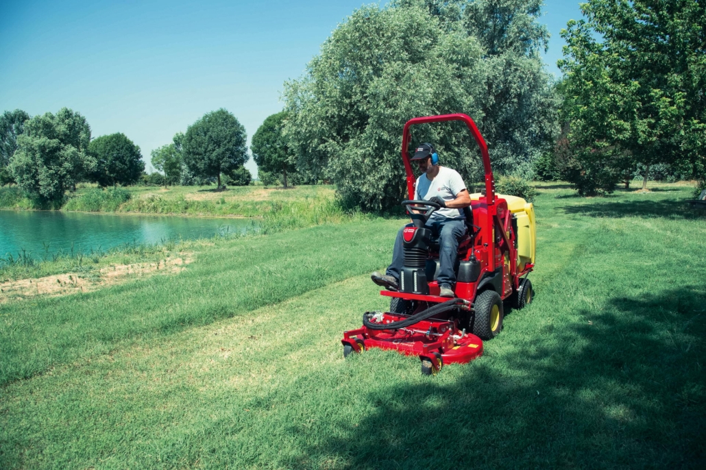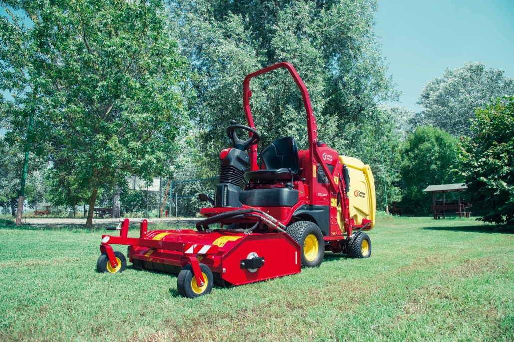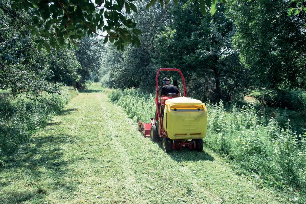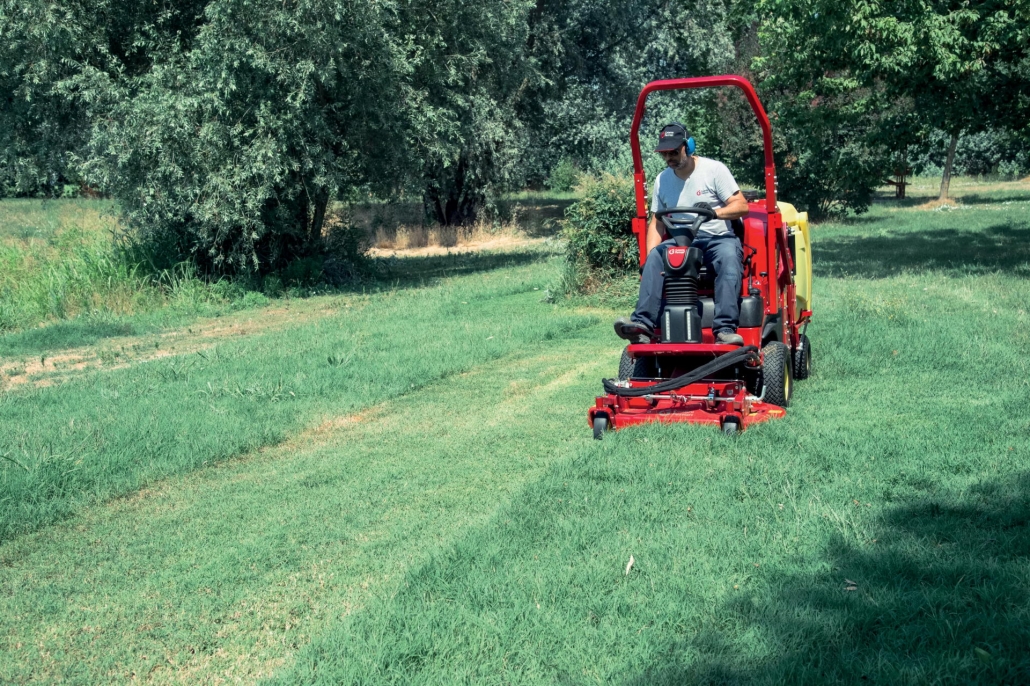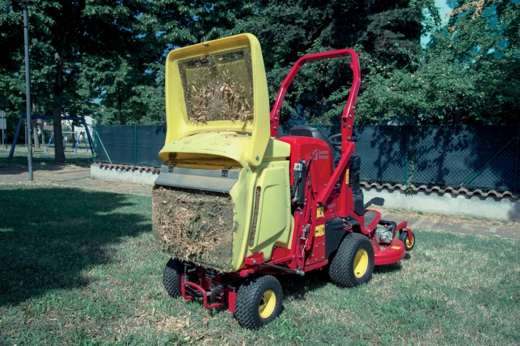 Переднее расположение навесного оборудования делает машину более маневренной, предоставляет оператору максимальный обзор и контроль работы, особенно при кошении вокруг деревьев, клумб, вдоль стен и скамеек. Косильные деки оснащены особой системой ножей, которая создает мощный воздушный поток, транспортирующий траву напрямую в бункер через широкий загрузочный коллектор. Система прямой подачи травы предотвращает засорение коллектора даже при кошении высокой и мокрой травы. Отдельный гидравлический рычаг позволяет легко поднимать и опускать все навесное оборудование. Благодаря увеличенному углу наклона навесного оборудования (в поднятом положении до 40), высокому клиренсу 19 см и большим задним колесам машина без проблем преодолевает бордюры и другие препятствия.