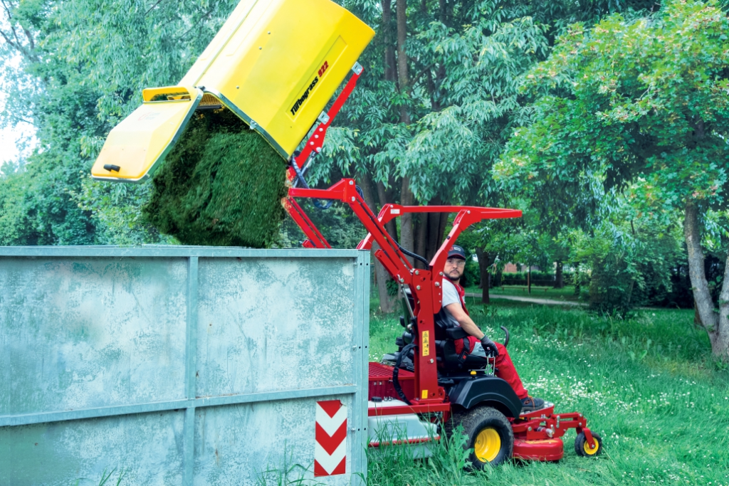 Дополнительная опция – гидроподъемник травосборника* позволяет оператору легко и быстро выгружать собранную траву и листву в кузов грузовика или прицепа.